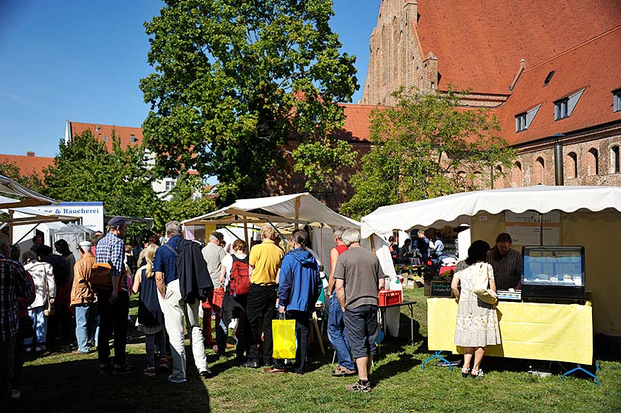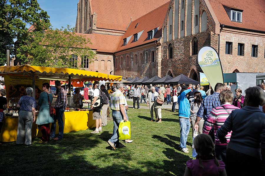 An den Ständen im Klostergarten konnten sich die Besucher durch die Regionen Brandenburgs kosten: Honig, Käse, Fleisch und Wurst, u.a. von Aueroxen, frisch geräucherter Fisch und bestes traditionelles Bier, Viez und andere Obstweine, Wild aus den heimischen Wäldern sowie Weiß- und Rotweine, die man unserem Klima nicht zugetraut hätte. Viele Produkte waren aus biologischem Anbau, obwohl das Bio-Zertifikat nicht zwingende Voraussetzung für die Teilnahme an dem Markt war: Traditionelle und handwerkliche oder manufakturmäßige Herstellung, regionaltypische Rezepte, hohe Qualität, Frische und alte, oftmals vom Aussterben bedrohte Tierrassen und Kulturpflanzen waren weitere wichtige Kriterien bei der Auswahl. Demeter-Betriebe waren daher ebenso vertreten wie traditionell arbeitende Regionalversorger. Frisches Backschwein stand neben der Initiative „Meine kleine Farm“, die dazu aufruft, das Schwein, welches man verzehrt, persönlich kennen zu lernen, ökologisches Saatgut fand regstes Interesse, ein Imkerverein hatte nicht nur stadteigenen Brandenburger Honig im Angebot, sondern auch Bienen im Lehrbienenstand zum Beobachten. Skudden, Wald- und Jacobschafe, Girgentana-Ziegen, Hausesel, Gänse und Hühner sorgten für eine ländliche Geräuschkulisse und waren die Stars des Marktes. Eine Ölmühle produzierte frisches Leinöl, verschiedene Essig- und Senfsorten sowie Kürbiskernspezialitäten rundeten das Angebot ab. Zwei Anbieter boten eigene Seifen und Naturkosmetika.