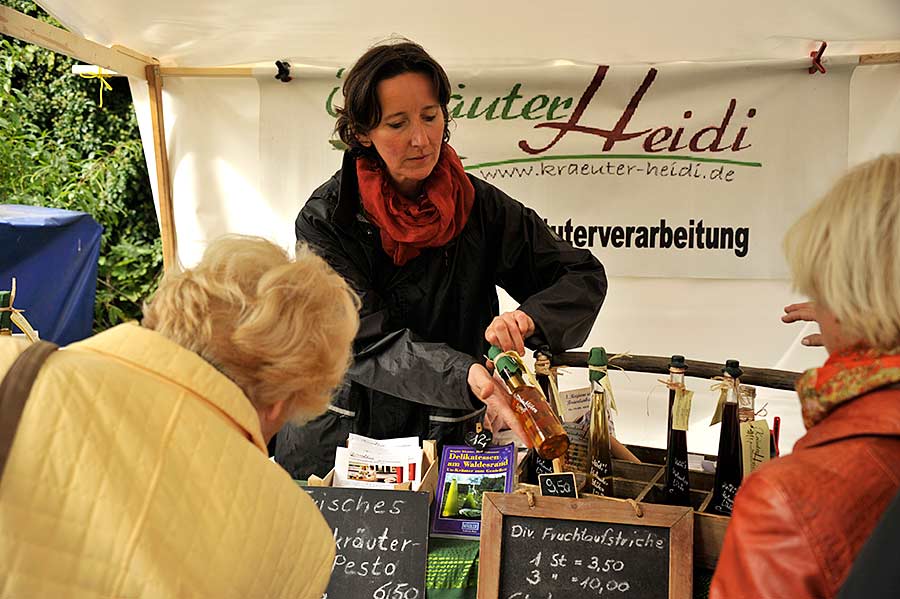 Keiner hatte mit einem derart regen Interesse gerechnet, auch die Vertreter des Slow Food Conviviums Potsdam nicht, die nun schon für das nächste Jahr Ideen entwickeln. Auch um die Stände von „green companies“ und vom Verbunde Ökohöfe Nordost scharte sich das interessierte Publikum, und die beiden Vertreter der Apfelwissenschaft stellten die reiche Palette an alten Apfelsorten vor, die es auf den brandenburgischen Streuobstwiesen noch gibt. Selbstverständlich gab es reichlich frischen Apfelsaft aus der direkten Umgebung. Alte Bauernblumensorten aus biologischem Anbau vom Fläming, diverse Sorten von Frühkartoffeln und Tomaten sowie Kräuterprodukte und Marmeladen fanden ihre Liebhaber.